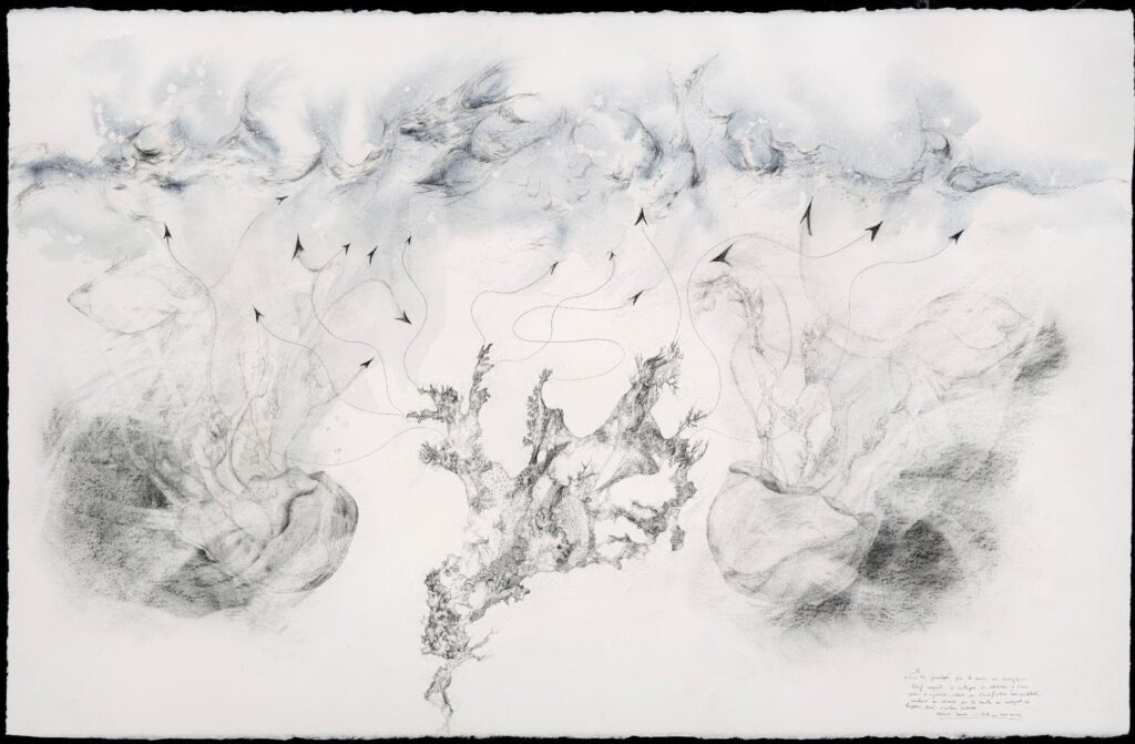 “Eau paralysée par le venin des cnidocytes. Récif essayant de rattraper la dilatation de l’eau pour sa symbiose, ralenti par l’acidification « anti-squelettale », crachant du calcaire par la bouche en envoyant ses harpons, orné d’autres cnidaires” – crayon et fusain sur papier Arches